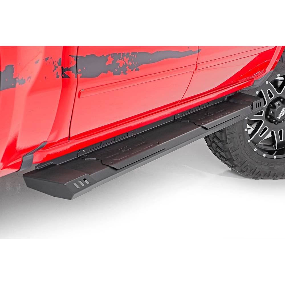 Swap out your skinny, factory running boards with Rough Country wider and more aggressive HD2 running boards. These beefy, cab-length running boards make it much easier to get in and out of your truck. With a durable all-steel construction and reinforced mounting solution, these running boards remain strong and sturdy through years of climbing into your cab. Each step features two non-skid plates with a stamped "RC" logo for good looks and easy entry. The "tech" style design gives your truck a unique look that's much more aggressive than factory steps, while the wider profile is perfect for proper footing and looks more proportional to the larger trucks of today.