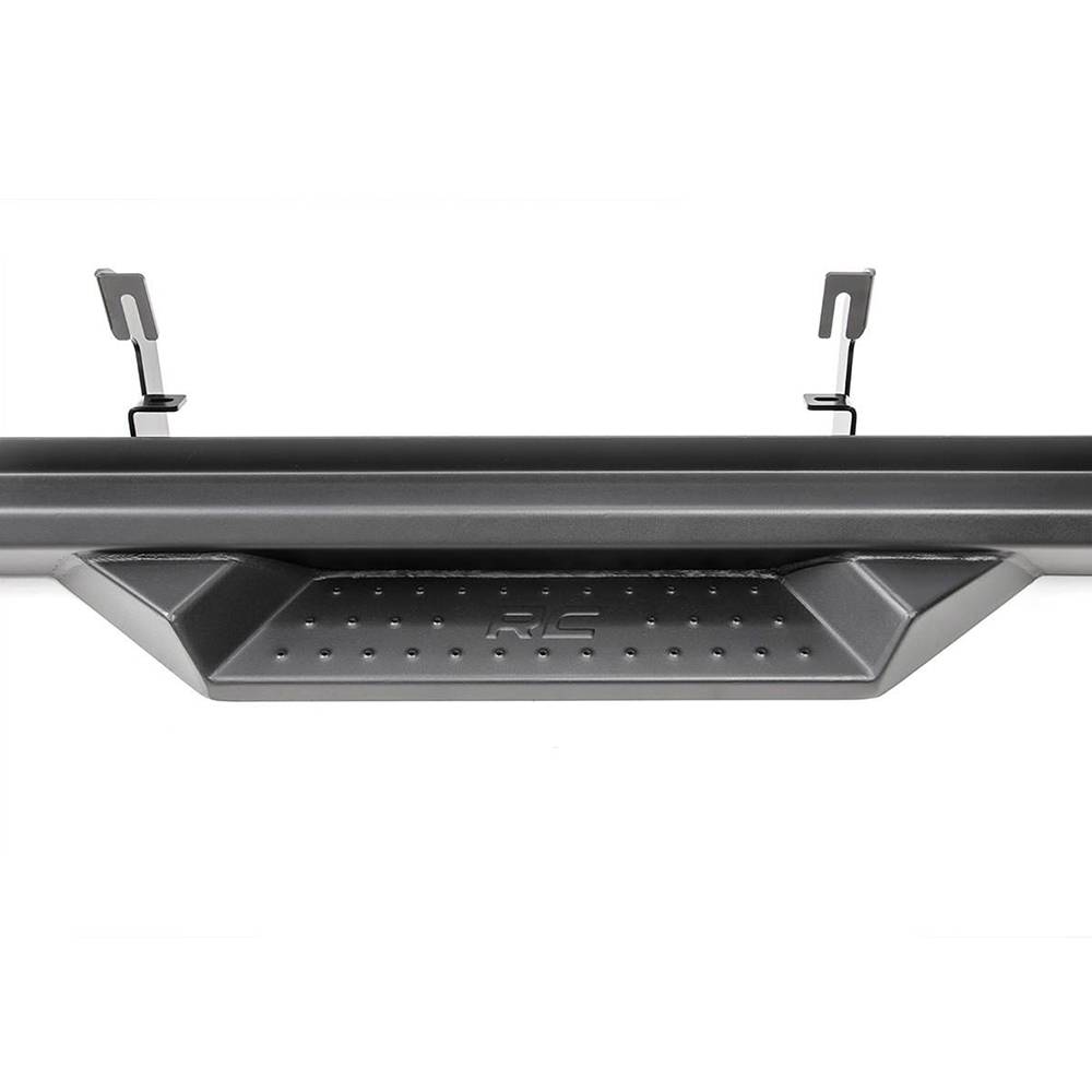 Gain incredible style and easier access to your truck with Rough Country DS2 drop steps. These stylish cab length steps offer a unique look for your vehicle, with two integrated drop steps to help you easily climb into your cab. Each integrated step is fabricated for strength and durability, and features a stamped tread and "RC" logo for a one-of-a-kind look and feel. These steel steps offer unrelenting reliability, powdercoated black to resist corrosion for a long life of great looks. Each step features a set of mounting brackets with a half-inch of adjustability to allow you to mount them closer or further from the body for the look and accessibility you prefer. Rough Country steps include a lifetime replacement warranty.