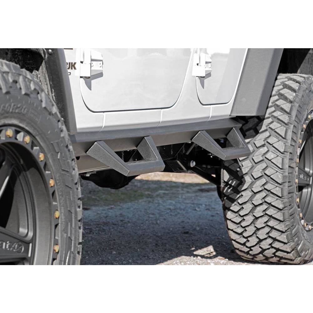 Get a one-of-a-kind, unique look for your Jeep JL with Rough Country contoured drop steps. These stylish wheel-to-wheel steps offer a unique look for your vehicle, with two integrated drop steps to help you easily climb into your cab. This step was engineered with a discrete, contoured design to perfectly complement the body lines of your Jeep JL, offering a tight, flush fit that looks good enough to be a factory option. Each integrated step is fabricated for strength and durability, and features a laser cut, accented "RC" logo for a one-of-a-kind look and feel. These durable steel steps offer unrelenting reliability, and are powdercoated black to resist corrosion for a long life of great looks. Rough Country steps include a lifetime replacement warranty.