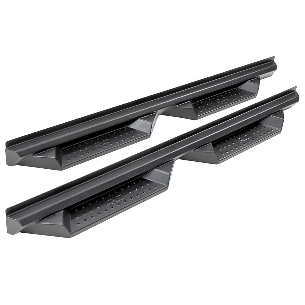 Gain incredible style and easier access to your Jeep with Rough Country DS2 drop steps. These stylish cab-length steps offer a unique look for your vehicle, with an integrated drop steps to help you easily climb into your cab. Each integrated step is fabricated for strength and durability, and features a stamped tread and "RC" logo for a one-of-a-kind look and feel. These steel steps offer unrelenting reliability, powdercoated black to resist corrosion for a long life of great looks. Each step features a set of mounting brackets with a half-inch of adjustability for the look and accessibility you prefer. Rough Country steps include a 3 year replacement warranty