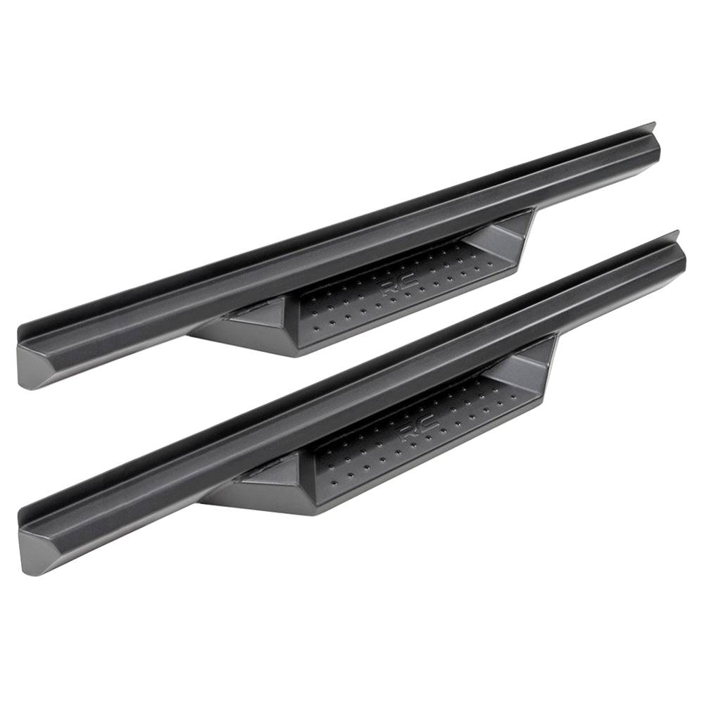 Gain incredible style and easier access to your Jeep with Rough Country DS2 drop steps. These stylish cab-length steps offer a unique look for your vehicle, with an integrated drop steps to help you easily climb into your cab. Each integrated step is fabricated for strength and durability, and features a stamped tread and "RC" logo for a one-of-a-kind look and feel. These steel steps offer unrelenting reliability, powdercoated black to resist corrosion for a long life of great looks. Each step features a set of mounting brackets with a half-inch of adjustability for the look and accessibility you prefer. Rough Country steps include a lifetime replacement warranty.