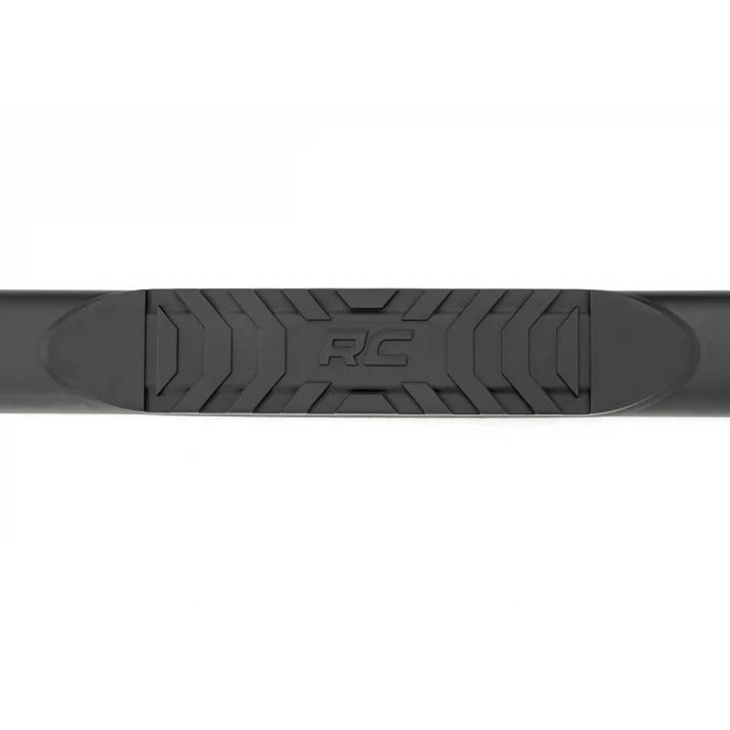 Gain easier access to your cab with the classic, OEM look of Rough Country oval nerf step bars. These durable, aluminum side steps feature a comfortable, 4.5" wide stepping area built into a large, tubular nerf rail that mimics the look of the popular OEM oval step design. Each nerf board features a long-lasting black powder coat and durable aluminum construction that can support up to 500 lb. Each step offers a 30-degree angled end design looks great on any vehicle. A secure, 4.5" wide stepping area features a non-slip pad to ensure a confident footing each and every time.