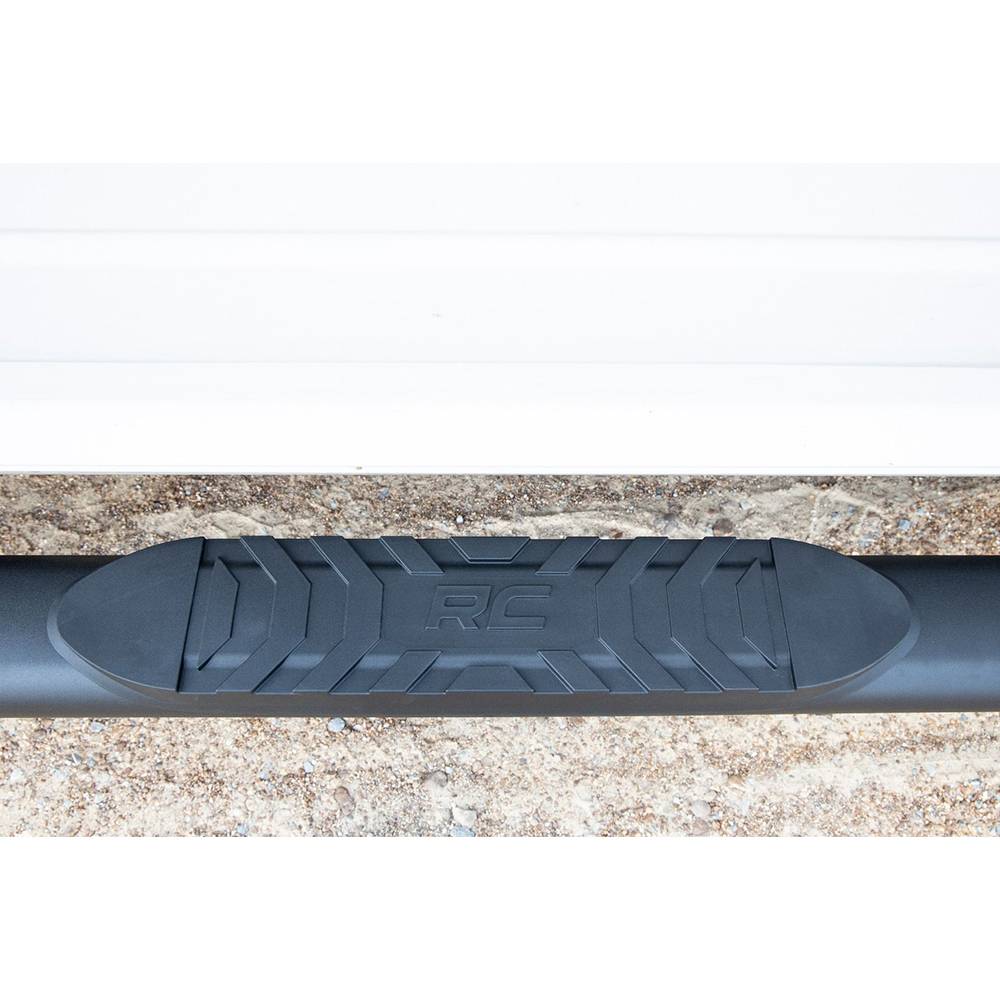 Gain easier access to your cab with the classic, OEM look of Rough Country oval nerf step bars. These durable, aluminum side steps feature a comfortable, 4.5" wide stepping area built into a large, tubular nerf rail that mimics the look of the popular OEM oval step design. Each nerf board features a long-lasting black powder coat and durable aluminum construction that can support up to 500 lb. Each step offers a 30-degree angled end design looks great on any vehicle. A secure, 4.5" wide stepping area features a non-slip pad to ensure a confident footing each and every time.