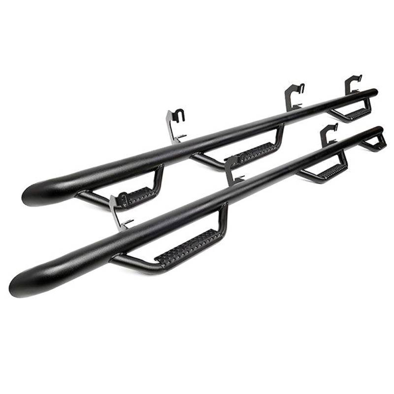 Rough Country new wheel to wheel nerf steps provide unrelenting style and easier access to your truck. These steps extend from one wheel well opening to the next, offering a clean install that lends to the look of your lifted truck. These steps can be installed on any vehicle, with or without a body lift. Innovative design actually hides any exposed frame you see under the truck, offering extra protection for your rocker panels. Rough Country nerf steps are made out of ultra-durable .084 wall corrosion resistant tubing with a zinc base coat and black finish for a sharp look thats ready to withstand the elements. Rough Country steps include a lifetime replacement warranty.