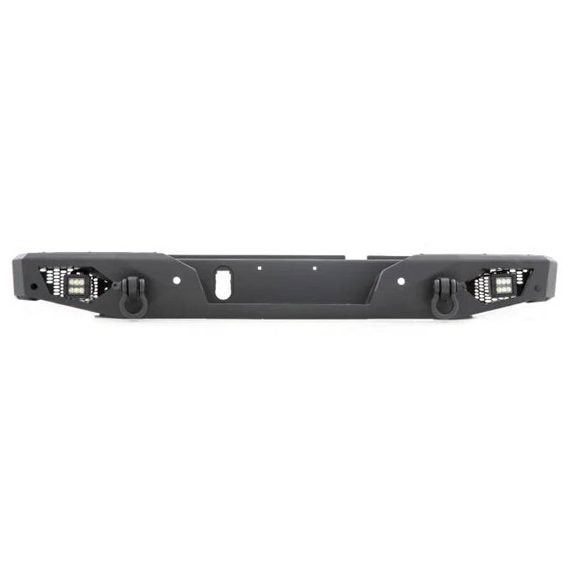 Beef up your JT rear end with Rough Country heavy-duty rear LED bumper. This stylish, durable steel bumper offers unbridled protection for the rear of your JT while giving you increased tire clearance for off-road articulation. With bold angles and contoured curves, this rear bumper is a true head-turner thats sure to get attention. Rough Country rear bumper features a all-steel construction for serious durability and comes coated in a corrosion-resistant, textured black powder coat to withstand the elements. Features a set of 2" LED cubes for rear illumination.