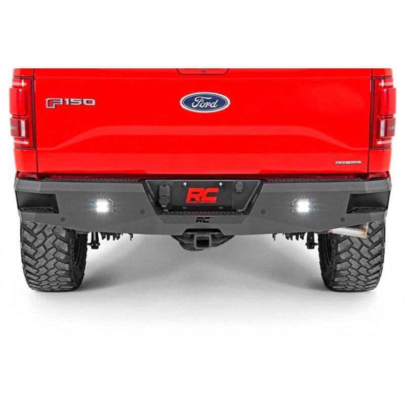 The rear of your F-150 an aggressive, new appearance with Rough Country rear LED bumper. This easy-to-install upgrade gives your truck an improved look and better functionality, with two pre-installed Rough Country LED cubes that offer impressive off-road illumination. Rough Country rear LED bumper is made of a durable, all-steel construction thats ready to handle whatever you dish out. Each bumper features two Rough Country black-series 2" LED flush mount cubes for rear illumination, and two integrated steps for easy access to the bed. Each bumper also includes sensor relocators to allow you to retain the vehicles anti-collision system. Unlike some aftermarket bumpers for this model, Rough Country LED rear bumper allows you to retain the factory receiver hitch for towing. Rough Country rear LED bumper is easy to install with common tools in a home garage. Best of all each bumper includes a 3-year warranty.