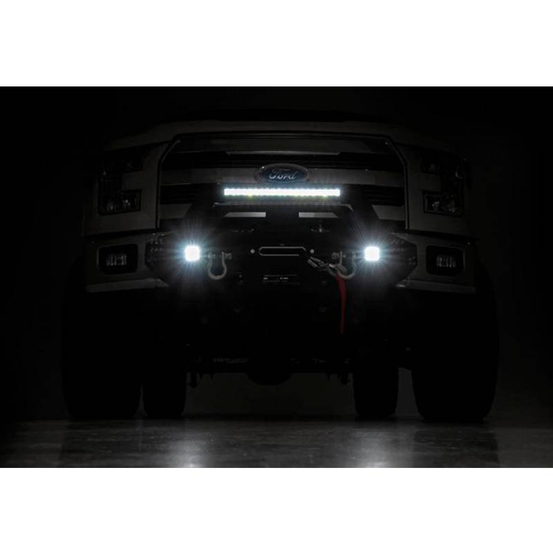 Add a professional recovery and lighting solution to your vehicle with Rough Country EXO winch mount system for ford F150. This innovative recovery solution bolts-on right over the factory bumper, giving your truck a wealth of new abilities and aggressive good looks. Rough Country EXO winch mount system features a 20" black series single-row LED Light bar and two flush mount black-series LED cubes for incredible off-road illumination. A rugged 1/4" thick steel winch mount can fit any standard-sized winch while a set of reinforced d-rings offer the perfect recovery point to get you out of any jam. Best of all, this kit is easy to install, with a 100% bolt-on installation process thats simple enough to do in any home garage and can be fully returned to stock at any time. Upgrade your truck with Rough Country EXO winch mount system and gain incredible recovery and lighting power in an instant.