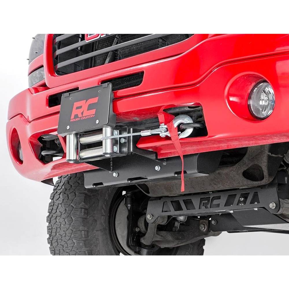 A sleek recovery solution that looks like factory equipment. Rough Country hidden winch plate for 99-06 Chevy / GMC 1500 offers a stylish approach for adding a recovery system to your pickup. Rough Country GM hidden winch plate can fit most standard size winches up to 12,000 lb and does not impede air flow to the radiator. Unlike many hidden winch solutions, Rough Country GM hidden winch plate boasts an easier install process that does not require moving your factory bumper from stock location. This kit also includes a wiring extension that allows you to easily connect your winch remote even though the unit is recessed into the bumper. With a black powder coated 1/4" steel frame and grade 8 hardware, this winch plate is ready to stand up to the elements, on and off-road. Includes Rough Country lifetime replacement guarantee.