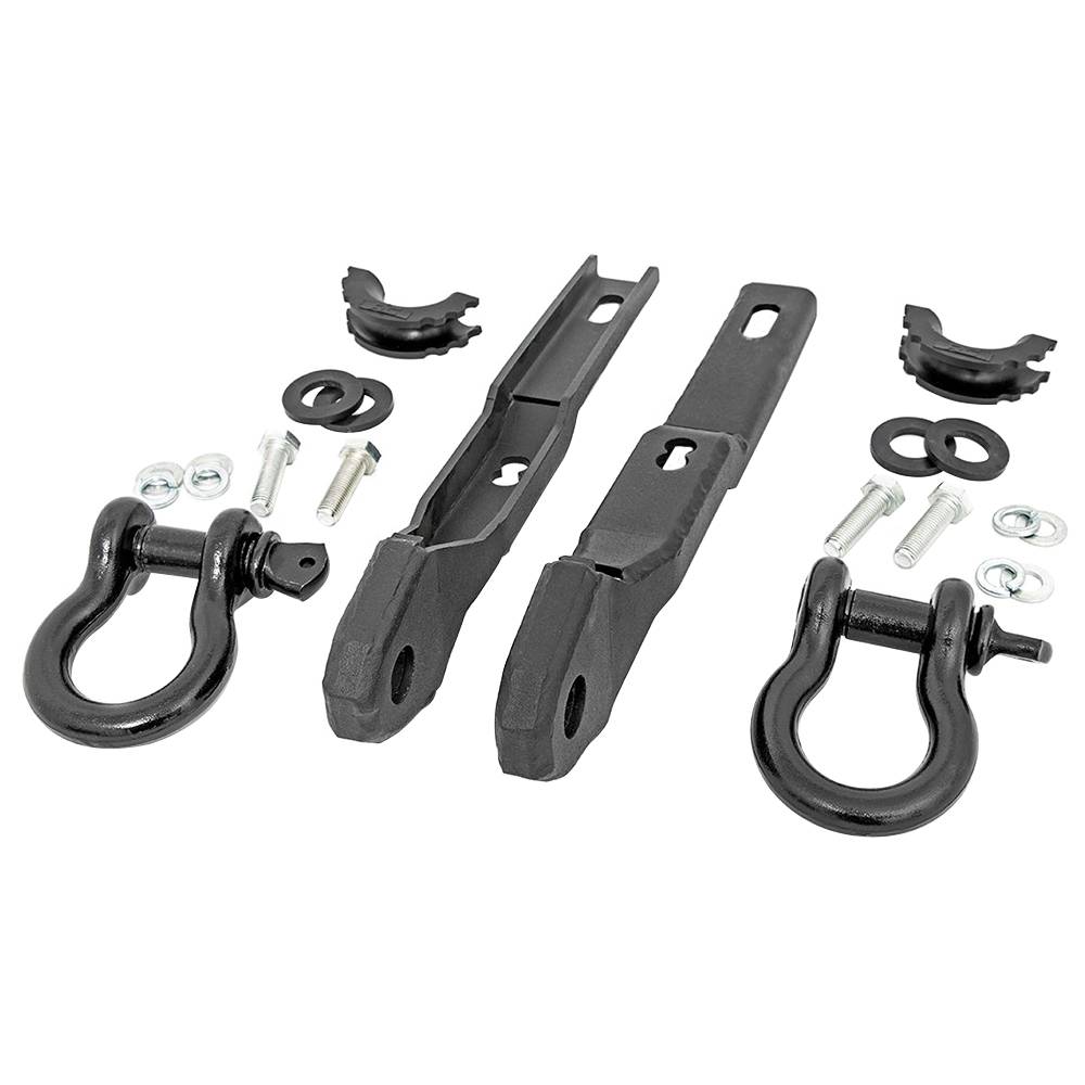 The Rough Country tow hook to shackle conversion kit. This easy to install upgrade replaces your factory tow hooks with a durable D-ring shackle mount that's easier to access and gives the front of your vehicle an eye catching look. Rough Country shackle mount bolts directly to the frame providing the same strength and durability as your factory tow hooks to aid in recovery in any situation. Each mount is powder coated black for a long lifespan of good looks and is designed to work with both factory and many aftermarket bumpers. The mounting point was engineered to accept any 3/4" D-ring shackle, allowing you to customize the look of your vehicle. Featuring a 100% bolt on installation process, this great-looking upgrade can be installed in a flash. Simply remove the factory tow hooks and install Rough Country tow hook to shackle conversion kit into the factory tow hook mounting points. Each mount is covered by Rough Country lifetime replacement guarantee.