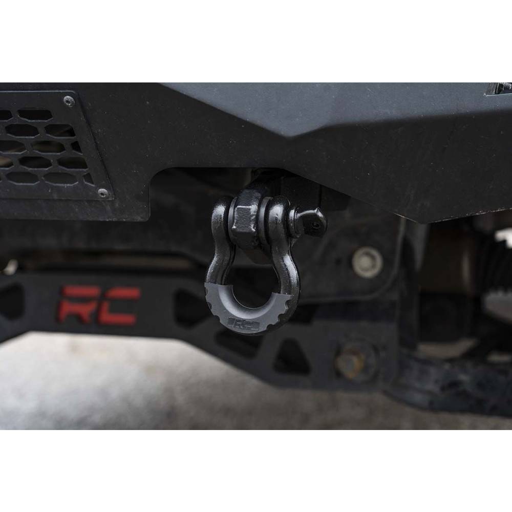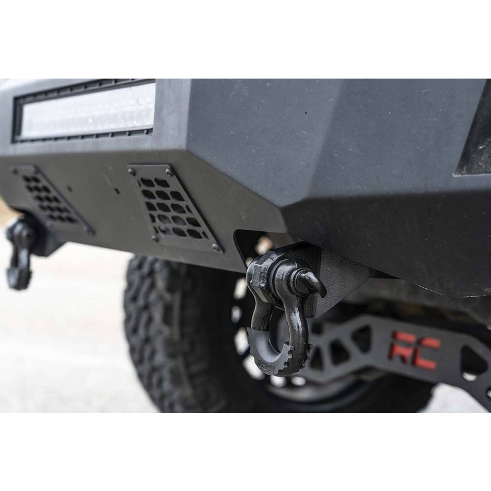 The Rough Country tow hook to shackle conversion kit. This easy to install upgrade replaces your factory tow hooks with a durable D-ring shackle mount that's easier to access and gives the front of your vehicle an eye catching look. Rough Country shackle mount bolts directly to the frame providing the same strength and durability as your factory tow hooks to aid in recovery in any situation. Each mount is powder coated black for a long lifespan of good looks and is designed to work with both factory and many aftermarket bumpers. The mounting point was engineered to accept any 3/4" D-ring shackle, allowing you to customize the look of your vehicle. Featuring a 100% bolt on installation process, this great-looking upgrade can be installed in a flash. Simply remove the factory tow hooks and install Rough Country tow hook to shackle conversion kit into the factory tow hook mounting points. Each mount is covered by Rough Country lifetime replacement guarantee.