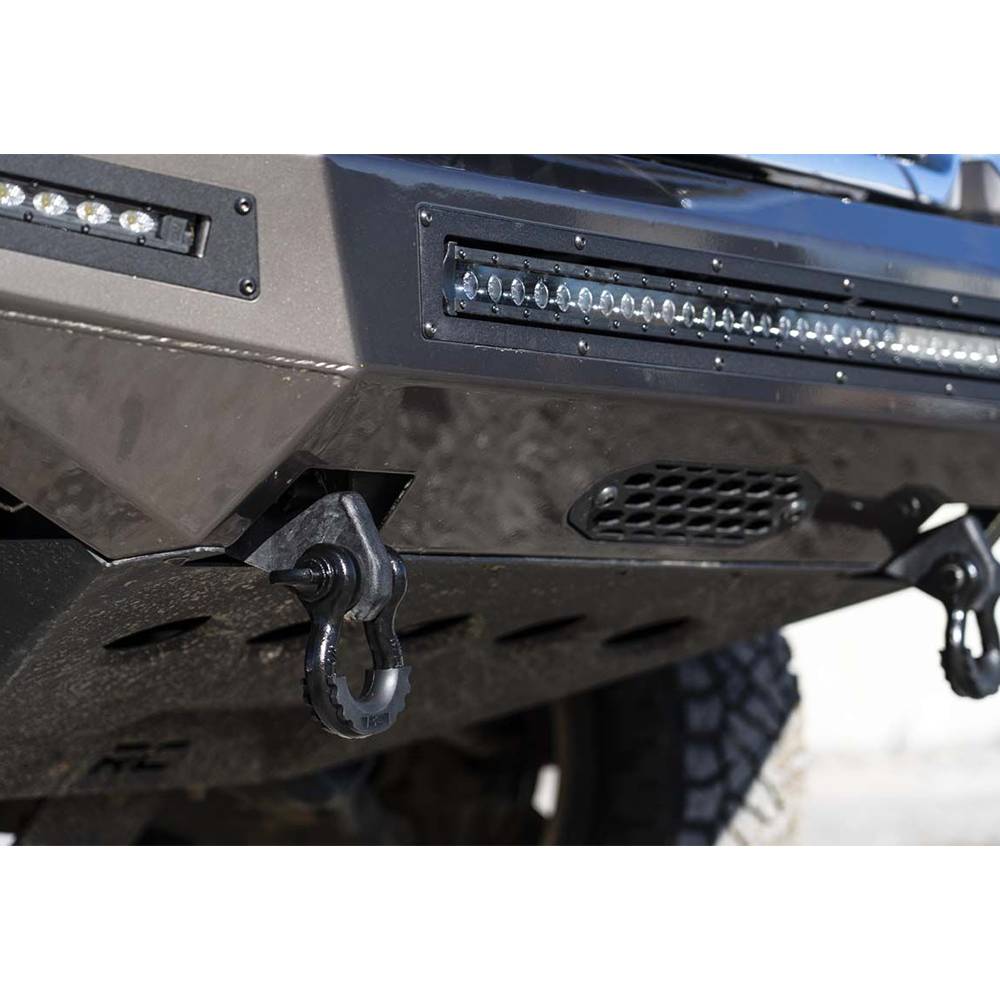 The Rough Country tow hook to shackle conversion kit. This easy to install upgrade replaces your factory tow hooks with a durable D-ring shackle mount that's easier to access and gives the front of your vehicle an eye catching look. Rough Country shackle mount bolts directly to the frame providing the same strength and durability as your factory tow hooks to aid in recovery in any situation. Each mount is powder coated black for a long lifespan of good looks and is designed to work with both factory and many aftermarket bumpers. The mounting point was engineered to accept any 3/4" D-ring shackle, allowing you to customize the look of your vehicle. Featuring a 100% bolt on installation process, this great-looking upgrade can be installed in a flash. Simply remove the factory tow hooks and install Rough Country tow hook to shackle conversion kit into the factory tow hook mounting points. Each mount is covered by Rough Country lifetime replacement guarantee.