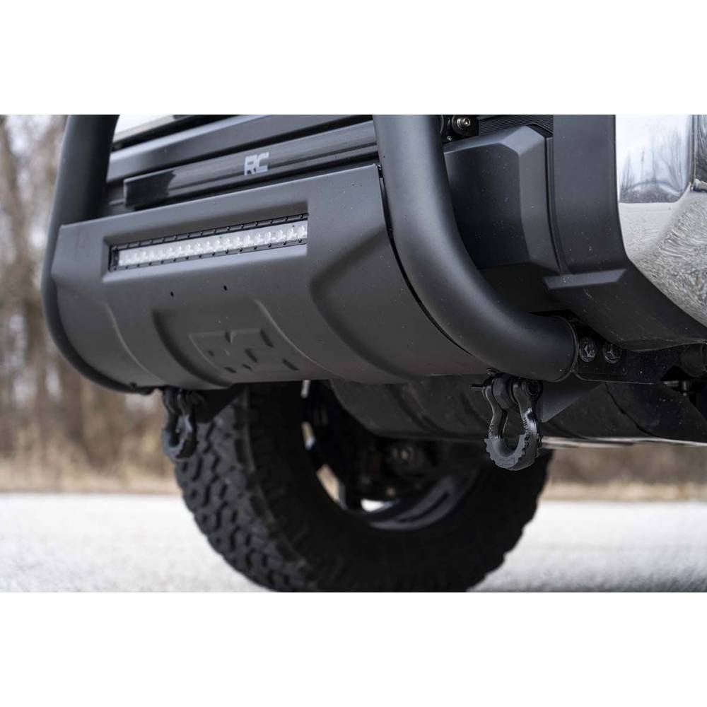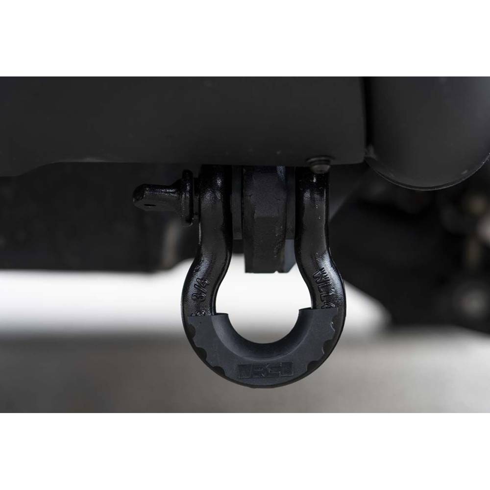 The Rough Country tow hook to shackle conversion kit. This easy to install upgrade replaces your factory tow hooks with a durable D-ring shackle mount that's easier to access and gives the front of your vehicle an eye catching look. Rough Country shackle mount bolts directly to the frame providing the same strength and durability as your factory tow hooks to aid in recovery in any situation. Each mount is powder coated black for a long lifespan of good looks and is designed to work with both factory and many aftermarket bumpers. The mounting point was engineered to accept any 3/4" D-ring shackle, allowing you to customize the look of your vehicle. Featuring a 100% bolt on installation process, this great-looking upgrade can be installed in a flash. Simply remove the factory tow hooks and install Rough Country tow hook to shackle conversion kit into the factory tow hook mounting points. Each mount is covered by Rough Country lifetime replacement guarantee.