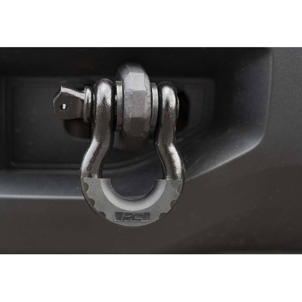 The Rough Country tow hook to shackle conversion kit. This easy to install upgrade replaces your factory tow hooks with a durable D-ring shackle mount that's easier to access and gives the front of your vehicle an eye catching look. Rough Country shackle mount bolts directly to the frame providing the same strength and durability as your factory tow hooks to aid in recovery in any situation. Each mount is powder coated black for a long lifespan of good looks and is designed to work with both factory and many aftermarket bumpers. The mounting point was engineered to accept any 3/4" D-ring shackle, allowing you to customize the look of your vehicle. Featuring a 100% bolt on installation process, this great-looking upgrade can be installed in a flash. Simply remove the factory tow hooks and install Rough Country tow hook to shackle conversion kit into the factory tow hook mounting points. Each mount is covered by Rough Country lifetime replacement guarantee.
